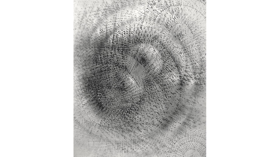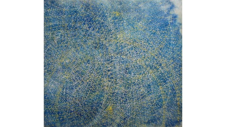 大きさの異なる三角定規を使い、放射状に広がる無数の線と点を描く独自の技法で、星空のような幾何学模様が浮かび上がる抽象画を描くアーティスト。 点と線、光、色彩で構成された作品は、宇宙、地表、地図など様々な解釈を促しながら、深い静けさと無限の広がりを表現しています。