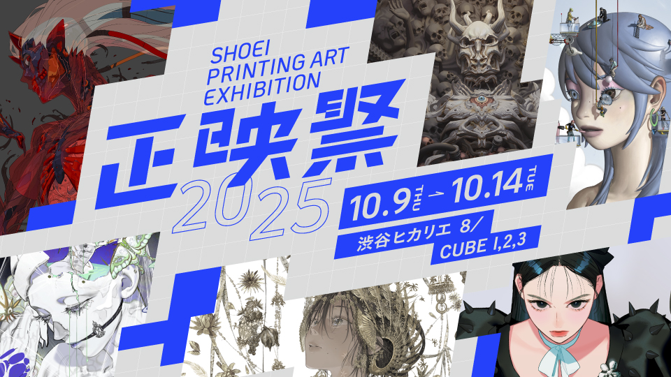 正映祭SHOEI PRINTING ART EXHIBITION 2025 会 期 2025年10月 9日(木) - 2025年10月14日(火) 時 間 11:00 - 20:00 ※最終日は19:00まで 場 所 8/CUBE1,2,3 料 金 入場無料 主 催 株式会社ショウエイお問い合わせ先:shoeisai@shoei-site.com 「正映祭2025」 株式会社ショウエイとイラストレーター6名によるデジタルイラストレーション作品を、 最先端のプリント技術で表現した展示会です。 昨年多くの反響をいただいた展示「正映祭(しょうえいさい)」の第2回を開催します。 様々な分野で活躍する6名のイラストレーターとともに、デジタルイラストレーションとUVインクジェット印刷の融合が生み出す新たな表現に挑戦。ニスやホワイトインクによる繊細な質感に加え、多様な素材の組み合わせやレーザーカットを駆使し、よりパワーアップした作品をお届けします。 また、今回も展示作品や複製原画、限定グッズを販売。新作のハーフトーンポスターやアクリルブロックなど、印刷の魅力を活かしたアイテムをご用意しました。 イラストレーターの想いを「正しく映し出す」多彩なプリント表現の世界を、ぜひ会場でご体験ください。 主催:株式会社ショウエイ https://www.shoei-site.com/ イラストレーター: 冨士原 良 https://x.com/wsise47 七癖みり https://x.com/Plul_Qdqdvh ilLUMI https://x.com/illumi99999 QINGYI https://x.com/Qingyi33 キギノビル https://x.com/sinsin08051 TERU https://x.com/teru_by_m 冨士原 良 トレンドを織り交ぜた現代⾵のテイストを得意とする。キャラクターデザインのほか、ゲーム・装画・CDジャケット・⾐装デザイン・漫画など、幅広く活動している。 @wsise47(X) / @ryo_fujiwara15(Instagram) 七癖みり 美術大学を卒業後、ゲーム会社を経てフリーランスのイラストレーター/キャラクターデザイナーとして独立して活動中。 代表作に「神式一閃カムライトライブ」キャラ作画制作監修など(2016〜2019年)/漫画「夜凪さんのよなよな餃子」執筆(勘米良優助名義)/アイドル「NARLOW」1stステージ衣装デザイン、メンバーイラスト/SEVEN’S TV所属Vtuber七福あかねキャラクターデザイン原案/刀剣乱舞より九鬼正宗デザイン、イラスト制作など。 @Plul_Qdqdvh(X) / @miri_nanase(Instagram) ilLUMI(イルミ) 中国出身。ニューヨークスクールオブビジュアルアーツでイラストレーションを専攻し卒業。 現在はイラストレーターとして活動しており、挿絵やアニメ映画、ゲームの美術デザインを手掛ける。 2021年にイラスト画集『昼と夜』を出版し、2022年から2024年にかけて東京、上海、杭州などで展示会を開催。 @illumi99999(X) / @illumi999(Instagram) QINGYI(チンイ) 中国出身、東京を拠点に活動するイラストレーター。幻想的かつ夢幻的な世界観を特徴とする作品を発表している。デジタルを中心に多様な技法を取り入れながら、視覚化の表現を追求。日本内外の媒体やコラボレーションを通じて幅広い層に作品を届けており、代表的な活動はYOASOBI五周年記念ジャケット「The book3」。 @Qingyi33(X) / @qing_yiii(Instagram) キギノビル 埼玉県在住のコンセプトアーティスト/イラストレーター 主に書籍装画などを手掛ける。 その他、ゲームやアニメのコンセプトアート、映画やライブの広告イラスト、CDのジャケット制作など幅広く活動中。 @sinsin08051(X)/ @sinsin08051(Instagram) TERU by mashcomix イラストレーター/アーティスト。多摩美術大学/美術学部/グラフィックデザイン学科卒。埼玉県出身。2008年よりフリーランスとして活動開始。 代表的な活動のひとつに大人気ゲーム実況者「兄者弟者」(2BRO.)のメインビジュアル、ロゴデザイン、ED映像などアート周り全般を手掛ける。 その他様々なゲーム&アニメ制作、コンセプトアート、キャラクターデザイン、広告ビジュアルや映像等のアートワークに携わり今日に至る。 オリジナル作品「REDTAIL」を手掛け日々自身の表現を模索している。2023年7月に初個展「GOOD FOR HEALTH」を開催。 今回の展示テーマの「強化骨格」もREDTAILに含まれるモチーフの1つである。 @teru_by_m(X) / @redtailworld(Instagram)