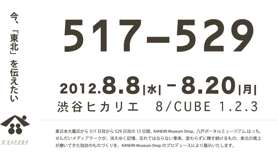 東日本大震災から517日目から529日目の13日間 KANEIRI Museum Shop、八戸ポータルミュージアムはっち、せんだいメディアテークが、消えゆく記憶、忘れてはならない事実、変わらずに輝き続けるもの、東北の風土が磨いてきた独自のものづくりを、KANEIRI Museum Shopのプロデュースにより展示いたします。
