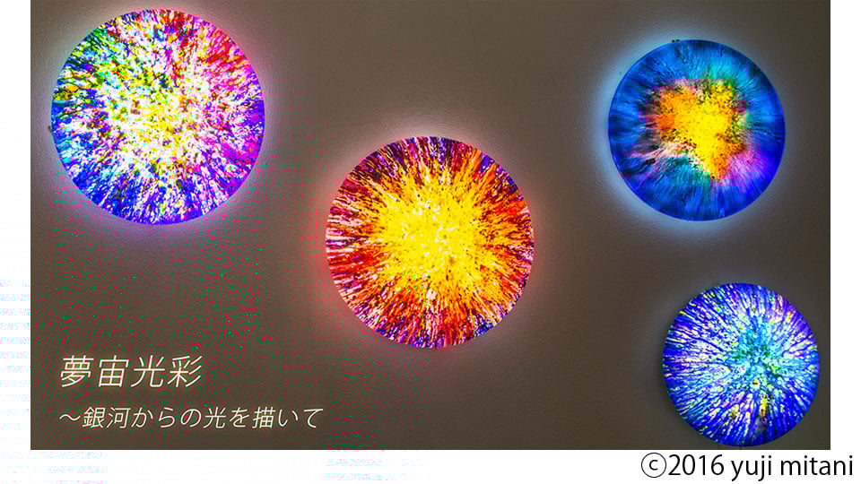 He named the series of this kind of the artworks “Dream Space Light Color (夢宙光彩, muchukousai)”, from which we feel the energy from the galaxy in our daily life. It is so to say a life illuminating Gorgeously Colored Art. It is brilliant like a fireworks and present a dreamy world like a kaleidoscope, so that there appears a comfortable space.