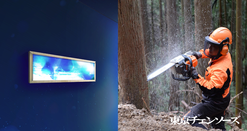 東京チェンソーズとのコラボレーション作品。デジタルアートが映し出された液晶ディスプレイが、本展オリジナル製作の木枠で形取られる。50年〜70年の時を経て収穫の時を迎えた木々が、檜原村の森林から切り取られ、木箱として形成される。「共鳴し融合する木箱」が、都市や日常から森と繋がる架け橋となることを願う。