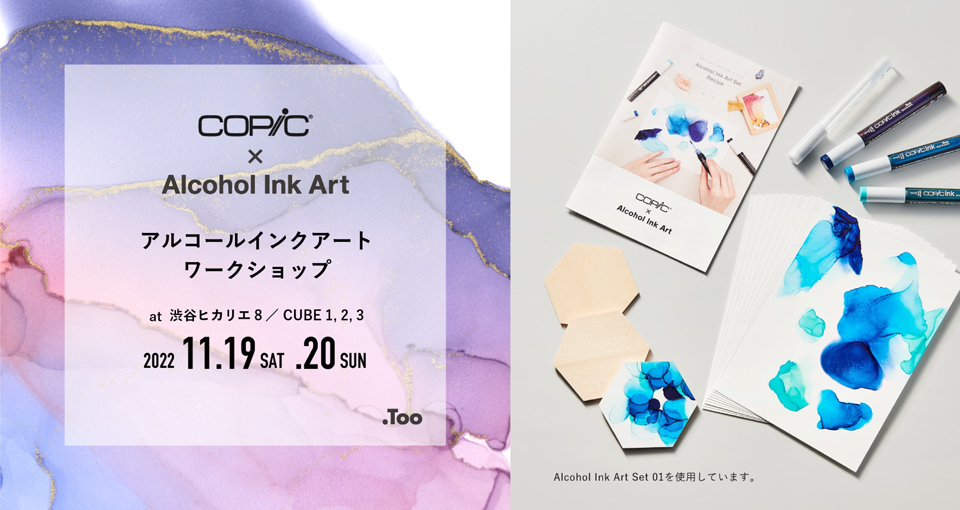 近年注目を集めているアルコールインクアート。ワークショップコーナーではインクアートを実際に体験していただけます。コピックインクを使って、偶然から生まれる幻想的で綺麗な色模様を楽しんでみませんか?