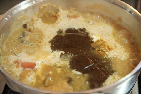 沸騰後、牛乳、ヨーグルト、カレールウを入れ、弱火で10分煮ます。