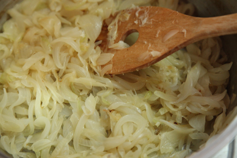 サラダ油大さじ1を入れ、薄切りにした玉ねぎを透き通るくらいまで炒めます。
