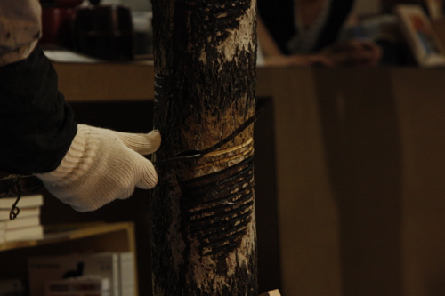 乳白色の漆がじんわりとにじんできます。1日100本の木をめぐり、少しずつ少しずつへらで採取。