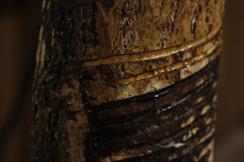 1回傷を付けたら、4、5日木を休ませます。1シーズンで、1本の木から牛乳瓶1本分(約200ml)しか採れないとは驚きです。10月が終わり掻き切ったら、木を伐採します。これを殺し掻きといいます。そこからまた15年、苗からだと20年かけて育てていきます。