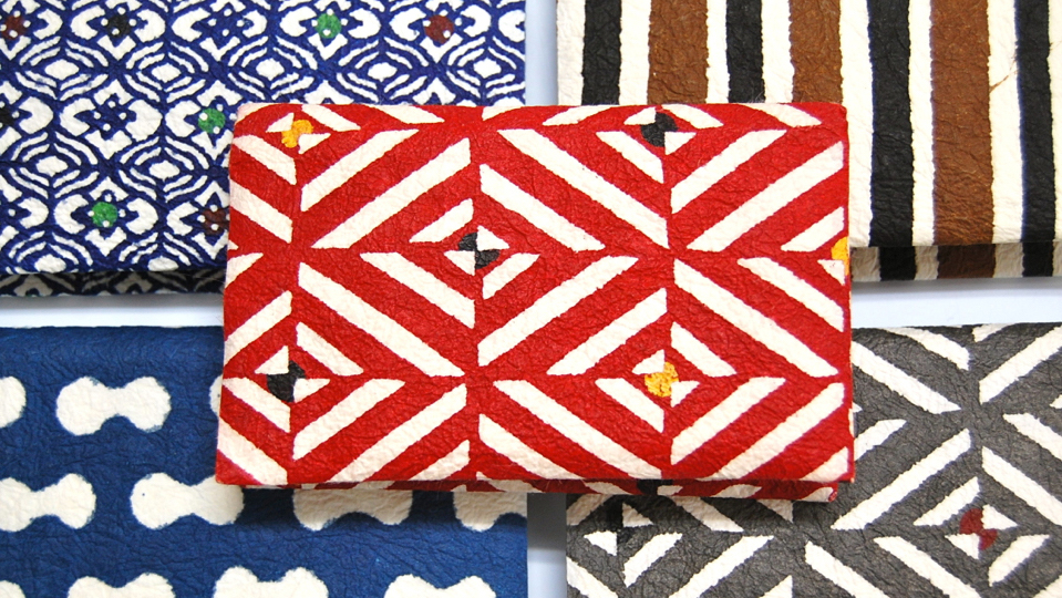桂樹舎は先代・吉田桂介が、染織家・芹沢銈介の元で学び、布ものの染色技術である「型染め」を取り入れた、鮮やかな柄が特徴です。厚手に漉かれ手で揉み込まれた、和紙とは思えない丈夫さは現代の生活にも取り入れやすいものばかりです。今回は、名刺入れやブックカバー、座布団などの生活用品をご紹介します。