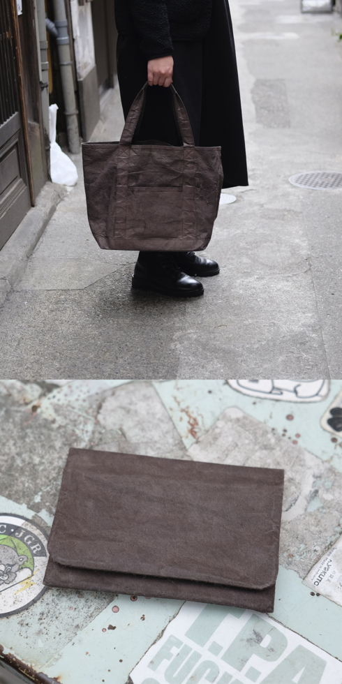 そんな「泥染め」の工程を担う「金井工芸」にて、今回特別に「SIWA|紙和」製品の染め直しを行なっていただきます。愛着をもって使い込んだ「SIWA|紙和」の製品を染め直してみませんか。くすみのあるブラウン色と、泥による独特な質感は革のような雰囲気もあり、使い込むことで、新たな経年変化が楽しめます。