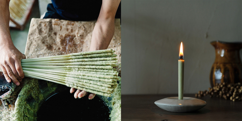 櫨蝋をつかった和ろうそく作りが体験できます。植物由来の成分だけでできたろうそくは、煙もなく美しい火が特徴。