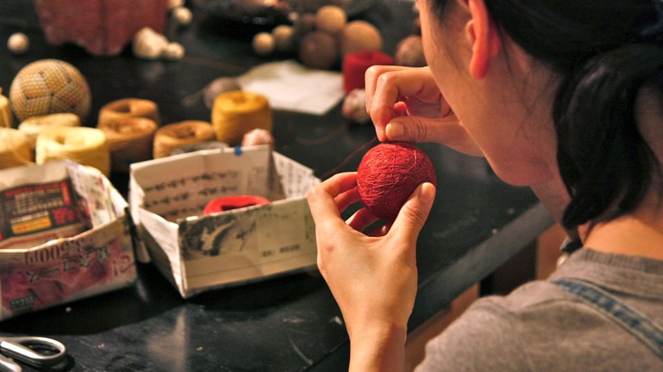 香川県讃岐地方の伝統工芸「讃岐かがり手まり」のかたちをつくるところから行います。