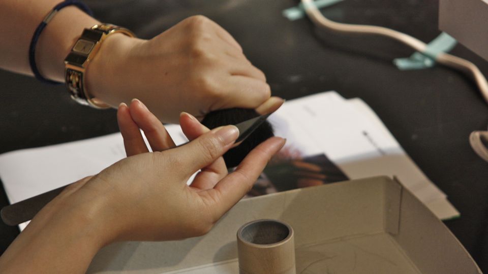 第一回目は、広島の熊野筆メーカー「瑞穂」による、チークブラシの穂首づくりを行いました。