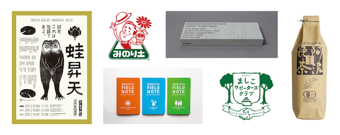 左から時計回り1.小板橋基希(山形)ポスター「蛙昇天」/2.西村太志(和歌山)ロゴマーク「GARDEN SOIL」/3.長嶋りかこ(東京) パッケージ「BAO BAO ISSEY MIYAKE × Rikako Nagashima(FREE HAND BAG)」/4.立花かつこ(徳島)パッケージ「阿波晩茶」/5.笹目亮太郎(茨城) ロゴマーク「ましこサポーターズクラブ」/6.土屋誠(山梨)リーフレット「HOKUTO FIELDNOTE」
