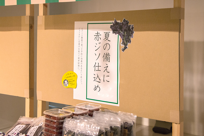 マーケット型展覧会「トマトが赤くなると医者が青くなる青果店」は、健康にまつわる生活の知恵を持つ農作物「健康知恵野菜」を集め、体の調子に合わせて旬のものを食べるという、かつては当たり前だった食文化を改めて考えるお店です。