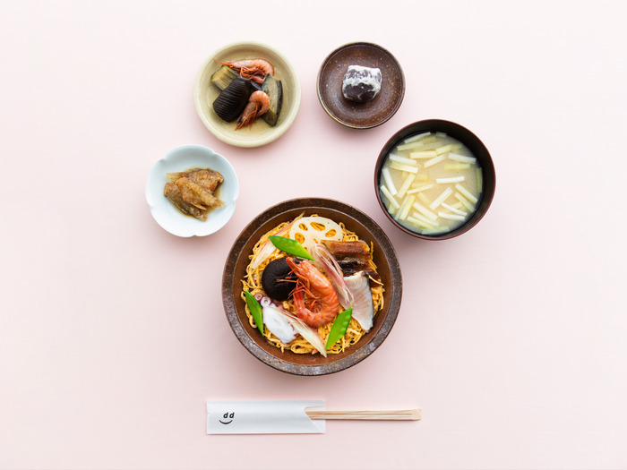 d47食堂スタッフが岡山県を旅して、名物や伝統料理を食べ歩き、生産者に取材しながら「その土地らしい定食」を考えました。備前ばら寿司、イシモチの唐揚げ、ガラエビ出汁の茄子の煮浸し、大手まんぢゅうの蒸し直し、黄ニラの味噌汁などの料理が登場する「岡山定食」は、併設のd47食堂で、実際にご賞味いただけます。(photo by yuji yamazaki)