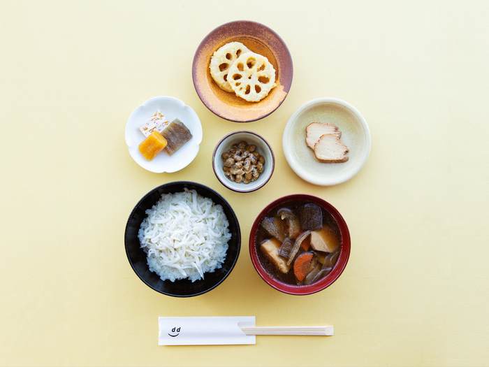 d47食堂スタッフが茨城県を旅して、名物や伝統料理を食べ歩き、生産者に取材しながら「その土地らしい定食」を考えました。釜揚げしらうおがたっぷりのったご飯、れんこんのてんぷら、農家の納豆(3種が週替わりで登場)、つと豆腐、けんちん汁、ほしいも3種食べ比べ、などの料理が並ぶ「茨城定食」は、併設のd47食堂で、実際にご賞味いただけます。(photo by yuji yamazaki)