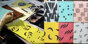 染めやデザインについてお話を伺いながら、「合羽摺り(摺り込み染)」で文庫本のカバーを一緒に製作します。シンプルな文様を型紙に彫り、反転したり、重ねたり、イメージの変化を楽しみながら染めていきます。また、同日にお話し会も開催します。