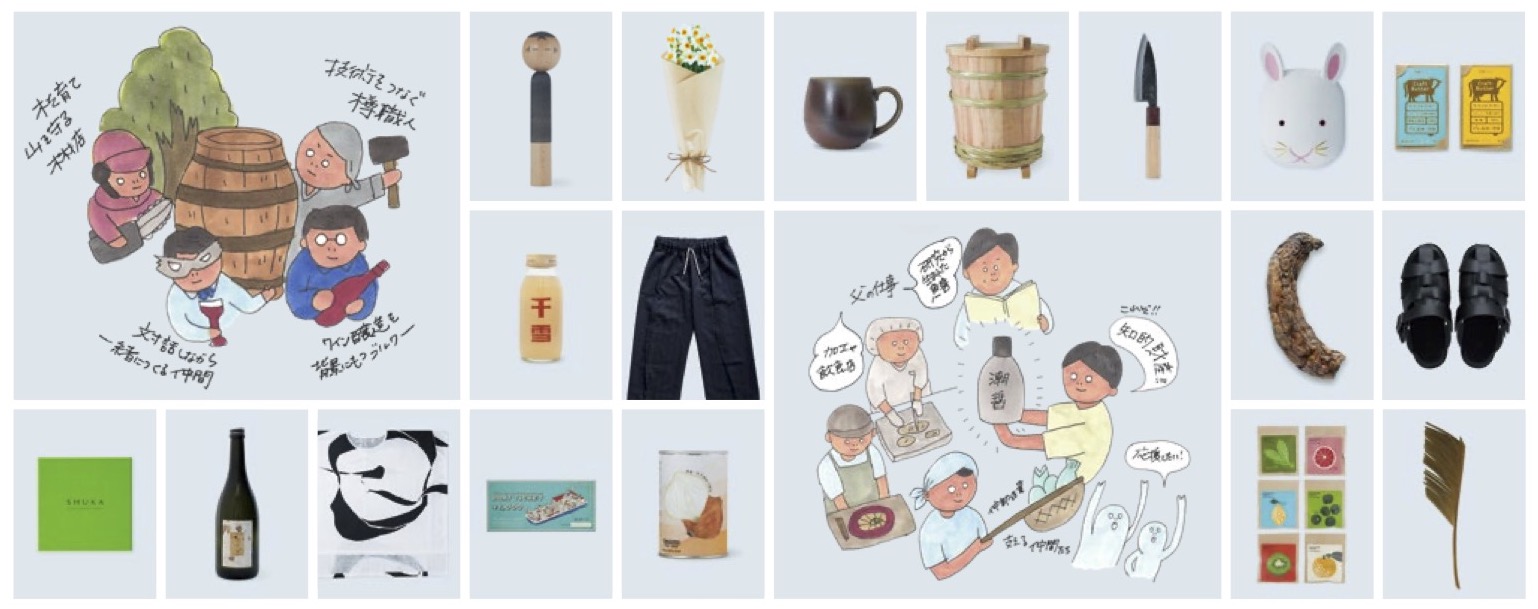 出展品例:宮城|桜井こけし Reflections、栃木|森林ノ牧場 発酵バター、群馬|ふふふ D-pants、岡山|the continue. # 再生備前シリーズ マグカップ、沖縄|島遊舎かぁらんやー ソテツ算