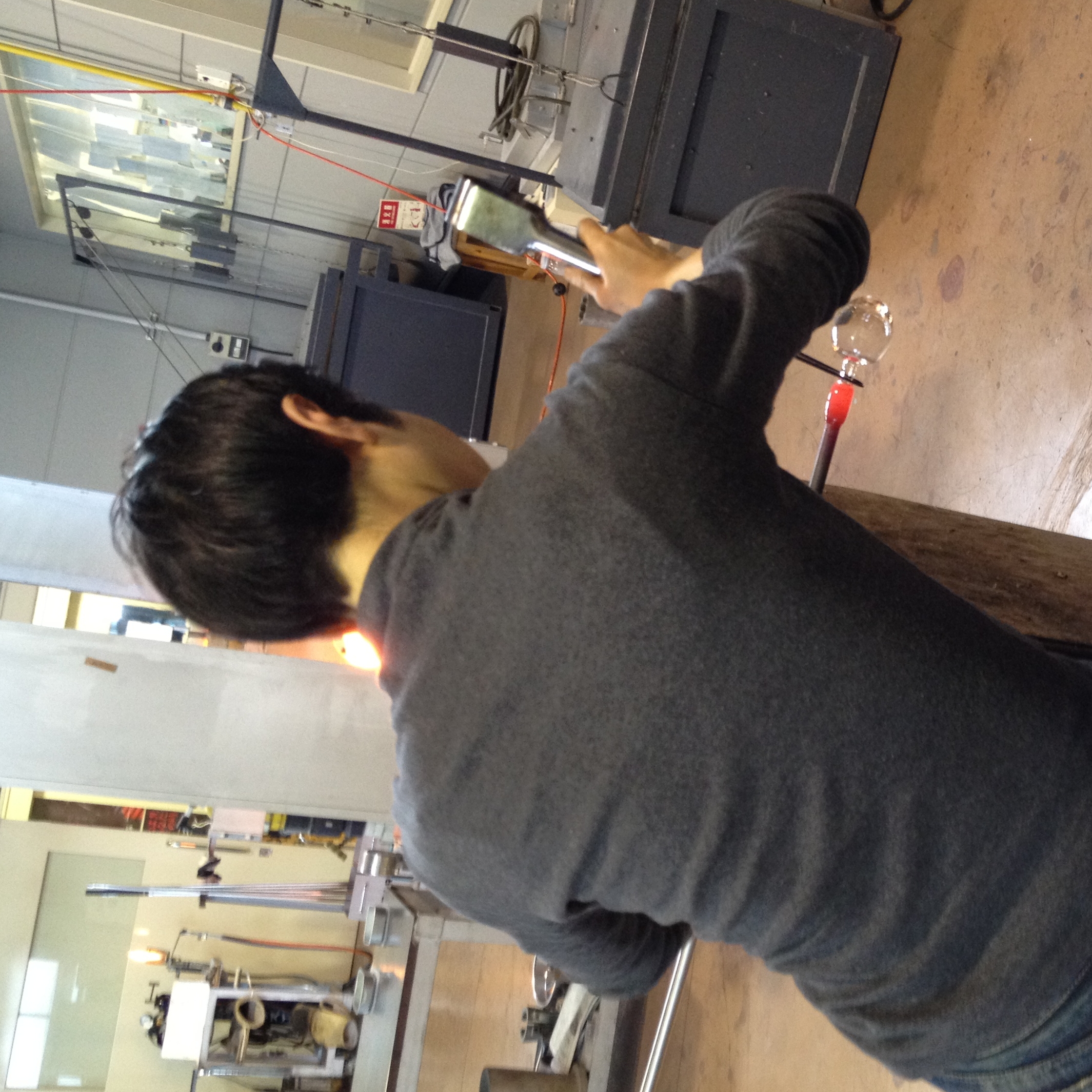 瓶ガラスは、ふだん吹いている工芸用ガラスとは異なり、機械生産用のガラスなので冷めやすく粘度があって扱いづらく、さらにそれをそのまま吹き竿の先にとって吹くなんてかなり無茶な作業なのですが、このやり方でのみ生まれる瓶の美しい表情があって、それをみなさまにも感じていただけたら本望です。