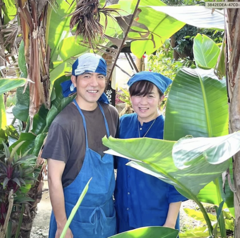 代表を務める比嘉京子さんと沖縄の伝統的な民具を作りながらワークショップ講師を担当する比嘉忠さん。瀬底島の古民家にて民具工房や島の台所「Tungah」を運営。身近な植物を使った草編み/民具作りワークショップの他、昔ながらの島の暮らしを学ぶ体験ガイド「ちいさな島の豊かなくらしガイド」など開催。