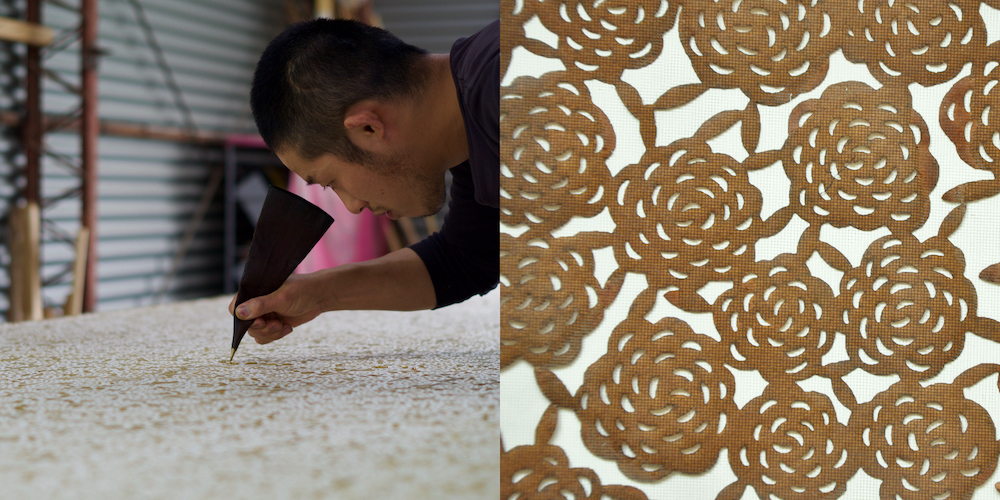 アートワークの「炎」と「文字」の文様の型紙を使い、江戸時代から続く技法「合羽摺り」で、布地に自ら色を塗り込む染め体験