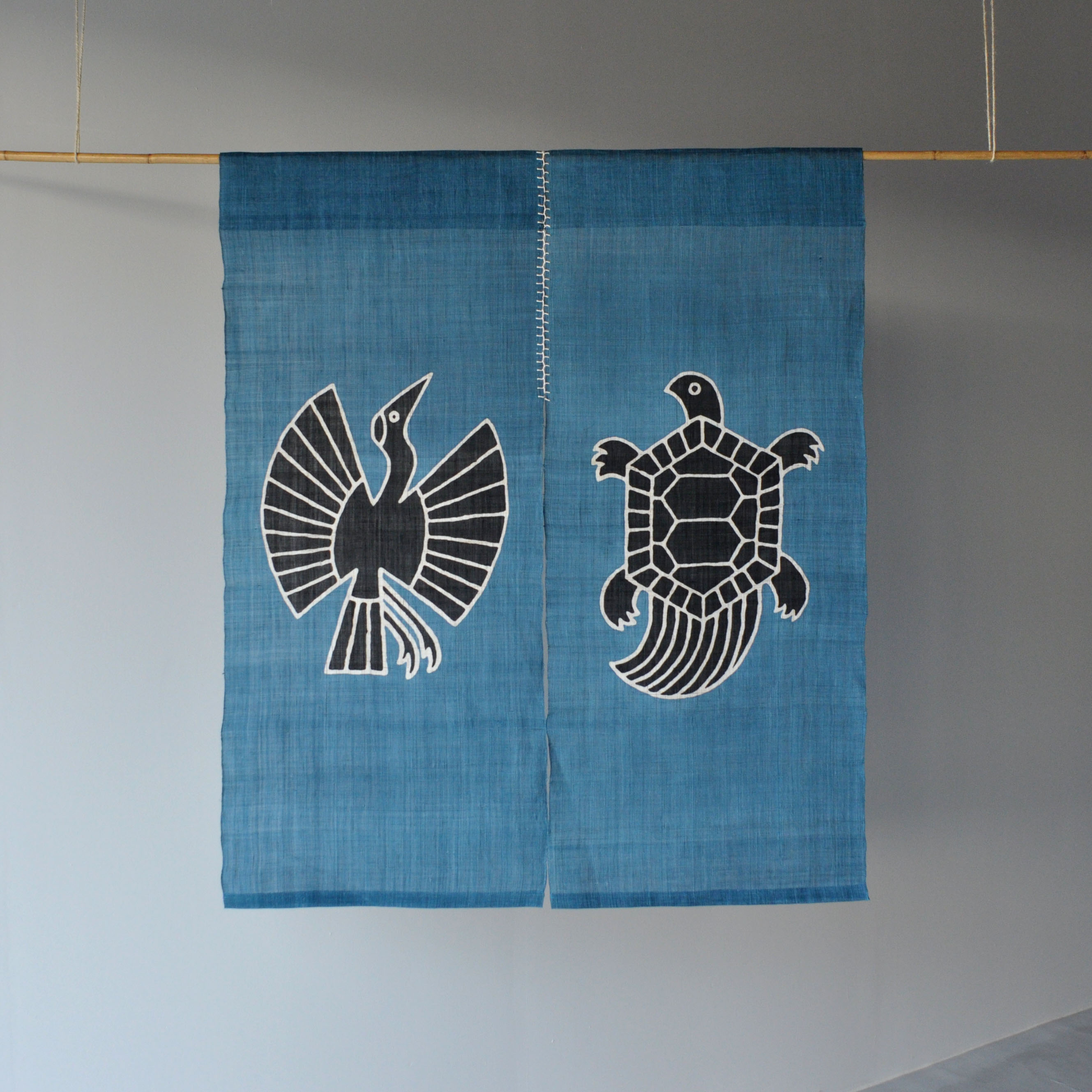 よつめ染布舎は、デザイナーの小野豊一さんが主宰する染工房。型染や筒描など伝統的な染めの技法を用いて、のれんやてぬぐい、衣服など、日々の暮らしを彩るテキスタイルを制作しています。小野さんが描く文様には、目に見えないものへの祈りや感謝など、私たちが抱えるたくさんの願いや思いが込められているのが特徴的。d47 MUSEUM 第37回企画展「47えんぎもの展」では、「火」が人の営みの原初的な存在だということに着想を得て、不動明王の後ろで燃え盛る「迦楼羅炎(かるらえん)」を元に「炎」をモチーフにしたアートワークをつくっていただきました。今回の企画では、様々な文様をあしらったのれんや衣服、小物などのアイテムをご紹介します。また、1月24日(土)には、小野さんの「炎」の文様を、ご持参いただいた布類に合羽摺り(かっぱずり)を行うワークショップも開催します。個性あふれる文様に触れ、持ち帰ることで、その力強さや安らぎを暮らしに取り入れてみてください。