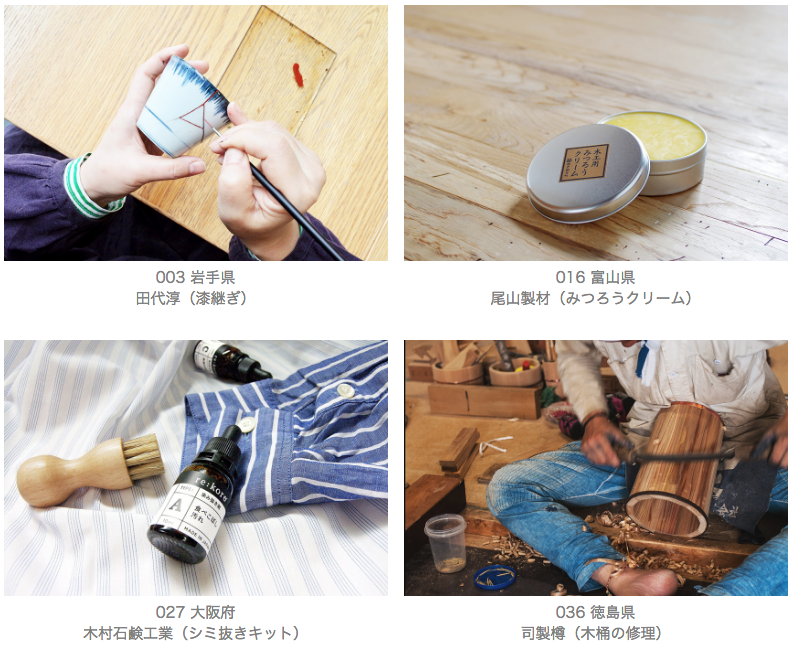 北海道:佐藤佳成 /青森:角舘徳子 /岩手:田代淳 /宮城:長谷部漆工 /秋田:栗久 /山形:須藤修 /福島:漆とロック(めぐる)/茨城:マルニファニシング /群馬:土田産業(Re:color)/埼玉:武州中島紺屋 /千葉:西千葉工作室 /東京:アートブラシ /神奈川:LIVRER YOKOHAMA /富山:尾山製材 /石川:目細八郎兵衛商店 /山梨:JewelryWorkshop GLENN /長野:山一 /岐阜:飛騨産業(Dr.kitutuki)/静岡:前田佳則 /三重:石川畳店 /滋賀:島村葭商店 /京都:洛中髙岡屋 /大阪:木村石鹸工業 /兵庫:andNUTS /奈良:白雪ふきん /和歌山:髙田耕造商店 /鳥取:谷口・青谷和紙 /島根:高橋鍛冶屋 /岡山:須浪商店 /広島:リシュラ(LOOP CARE)/山口:中原木材工業 /徳島:司製樽 /愛媛:三浦綿業 /高知:tretre(トレトレ) /福岡:内野樟脳 /佐賀:フリーマム /長崎:五島椿本舗 /熊本:地の塩社 /鹿児島:金井工芸 /沖縄:amaumi