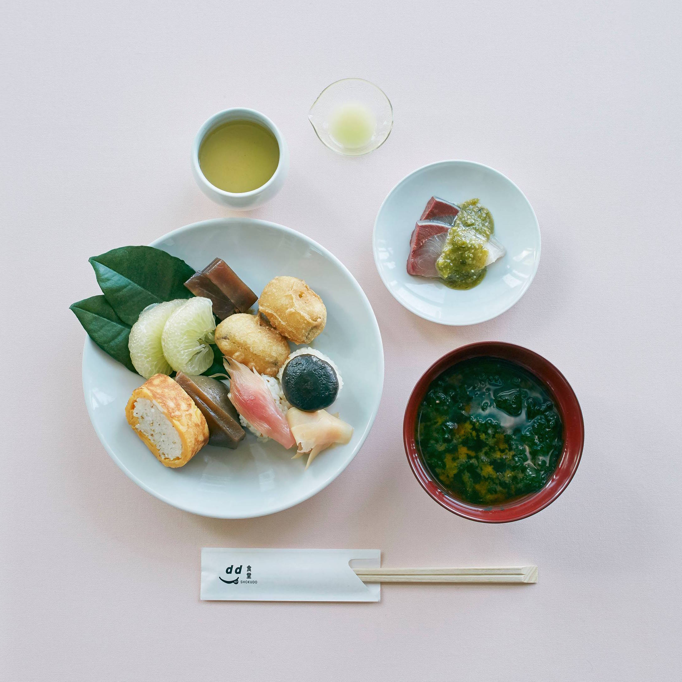 もてなしの郷土、高知県の、おきゃく定食。柚子酢を使った田舎寿司、にんにく葉のぬたをを使った料理が登場する「高知定食」は、3月7日(木)〜4月22日(月)(予定)まで、d47食堂でお召し上がりいただけます。高知のお茶やお酒なども合わせてお楽しみください。
