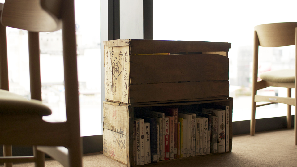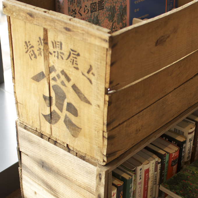 小布施町で実際に使われていたりんご箱が、それぞれの席の間に並びます。ロングライフや47都道府県、という切り口で、写真集から、エッセイ、絵本まで。まちとしょテラソの館長である花井 裕一郎さんをはじめ、テラソのみなさんに選んでいただきました。