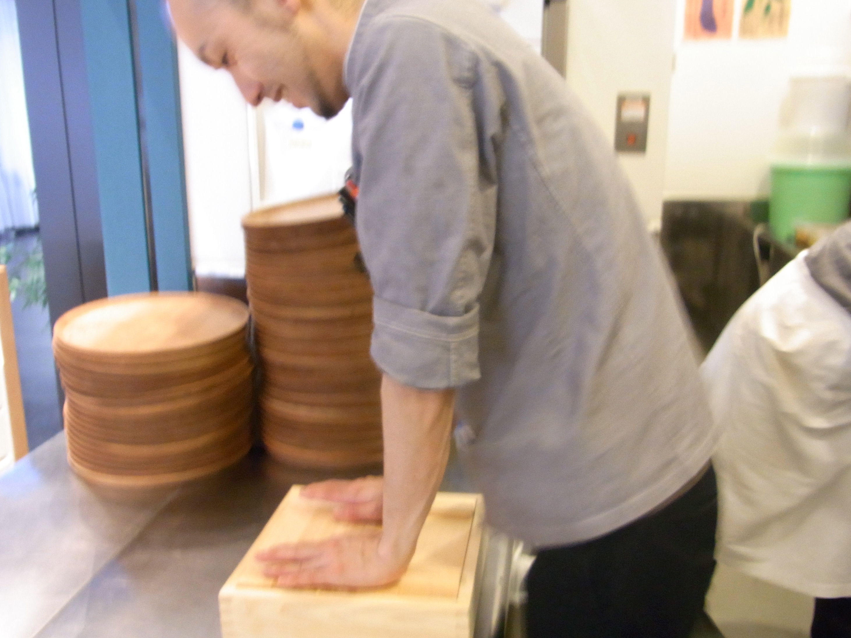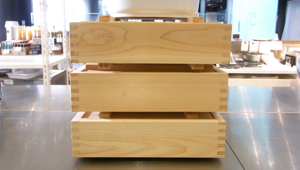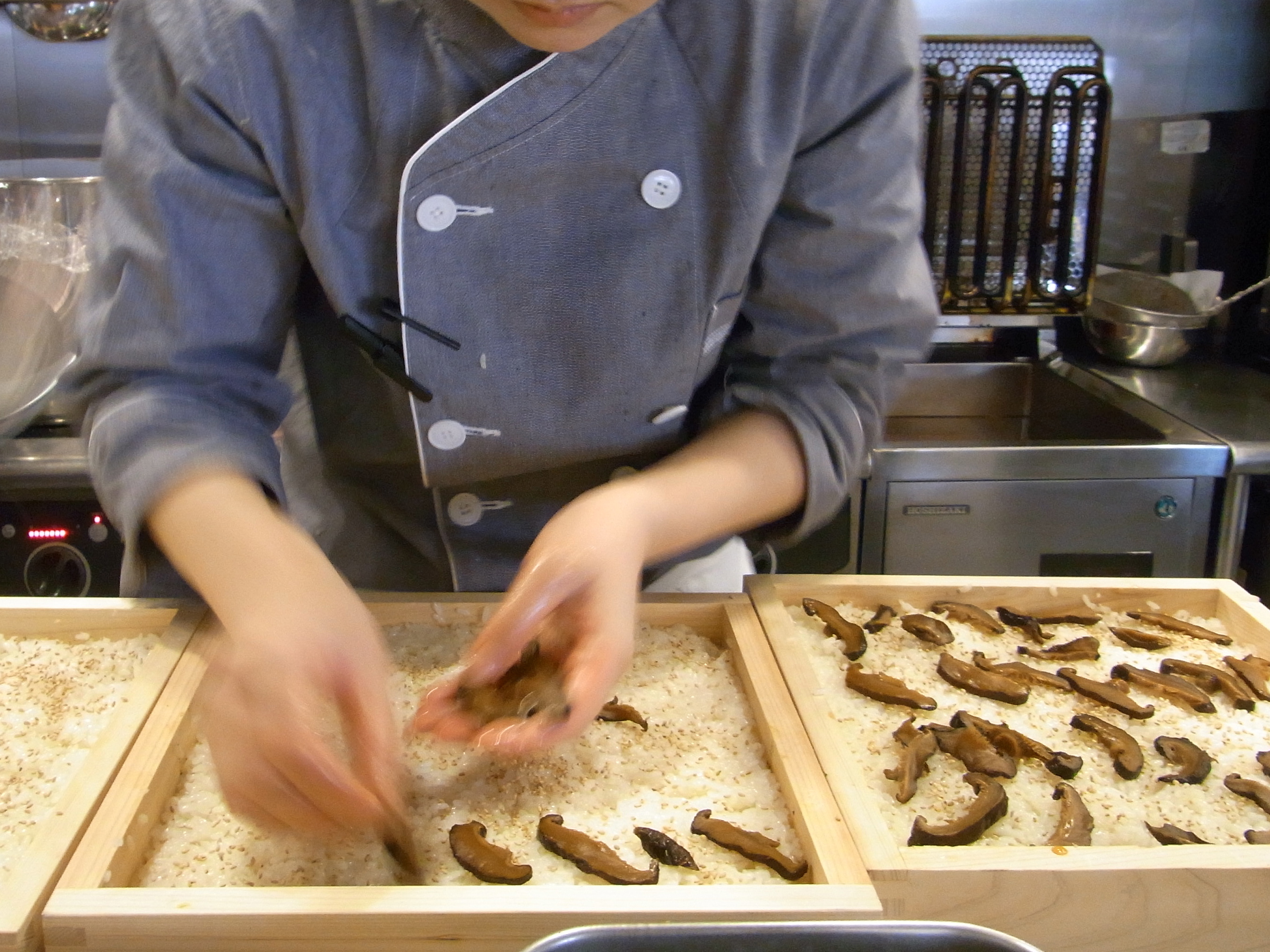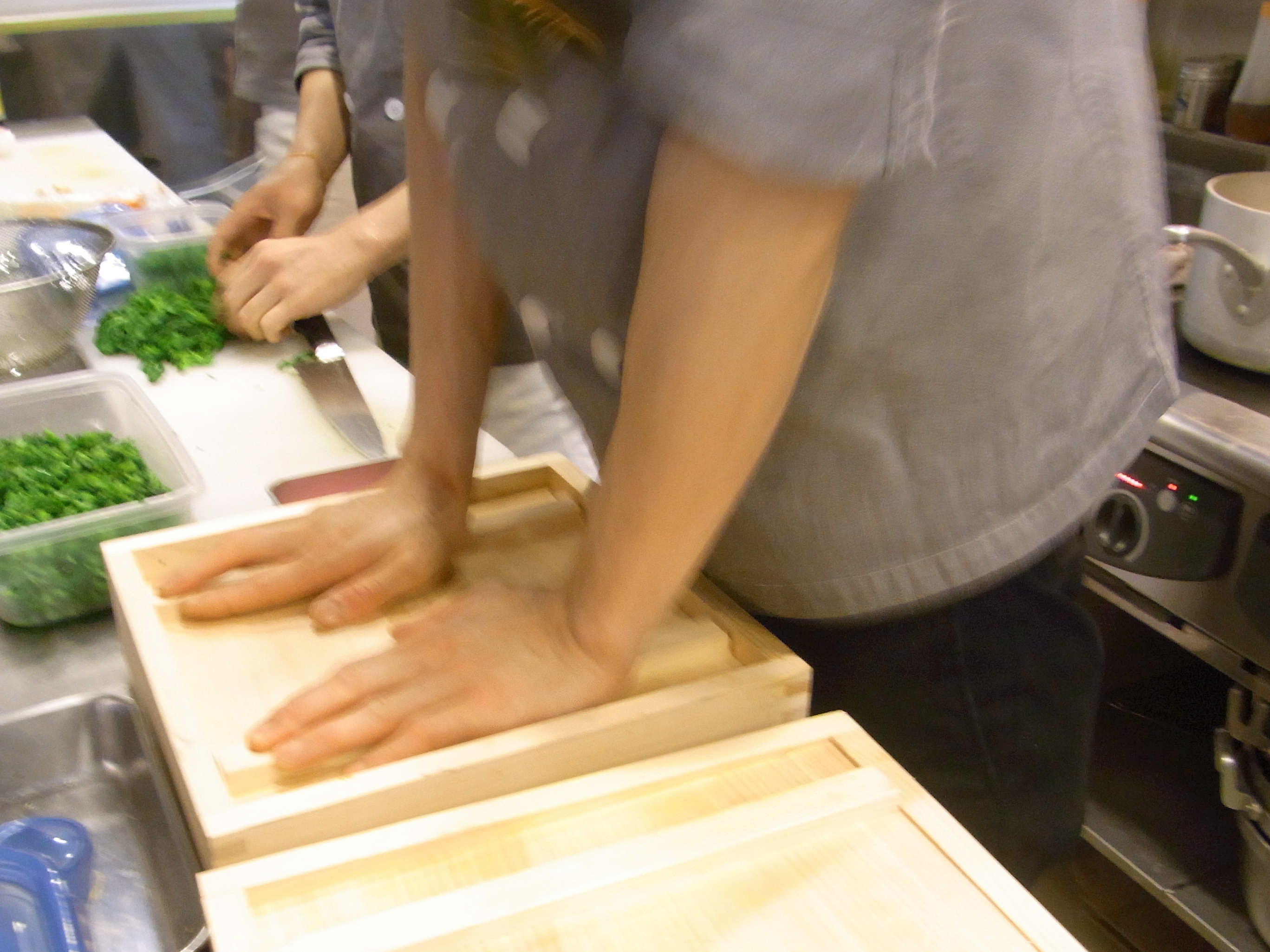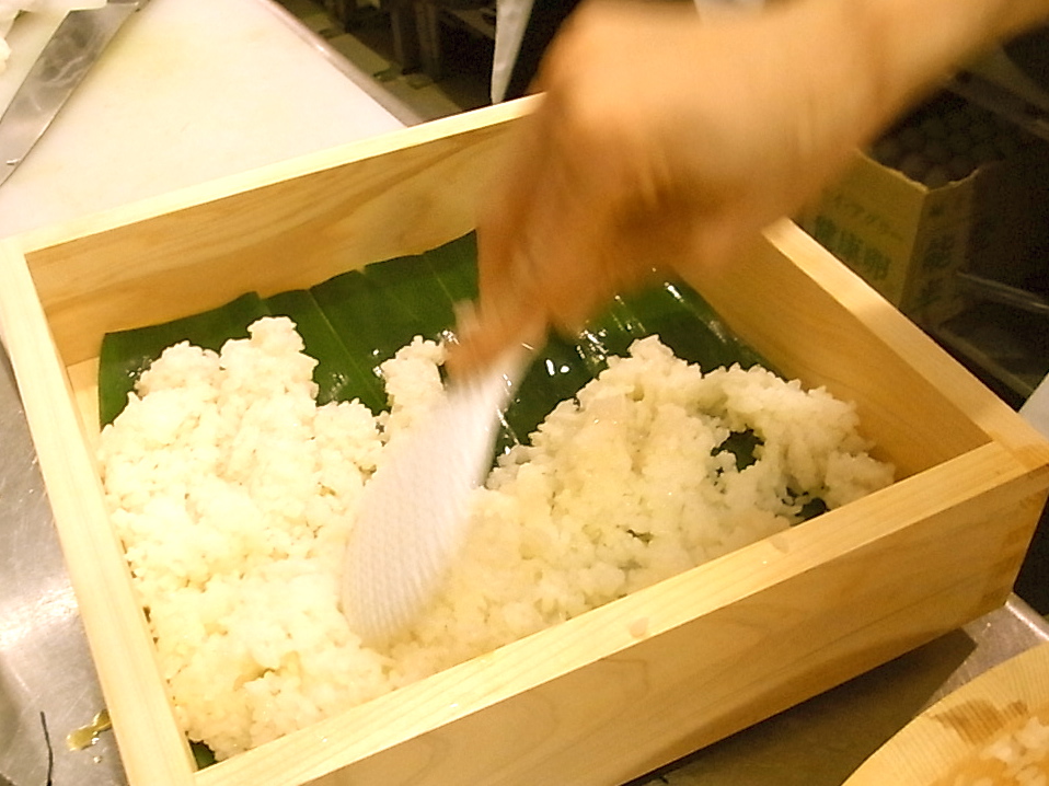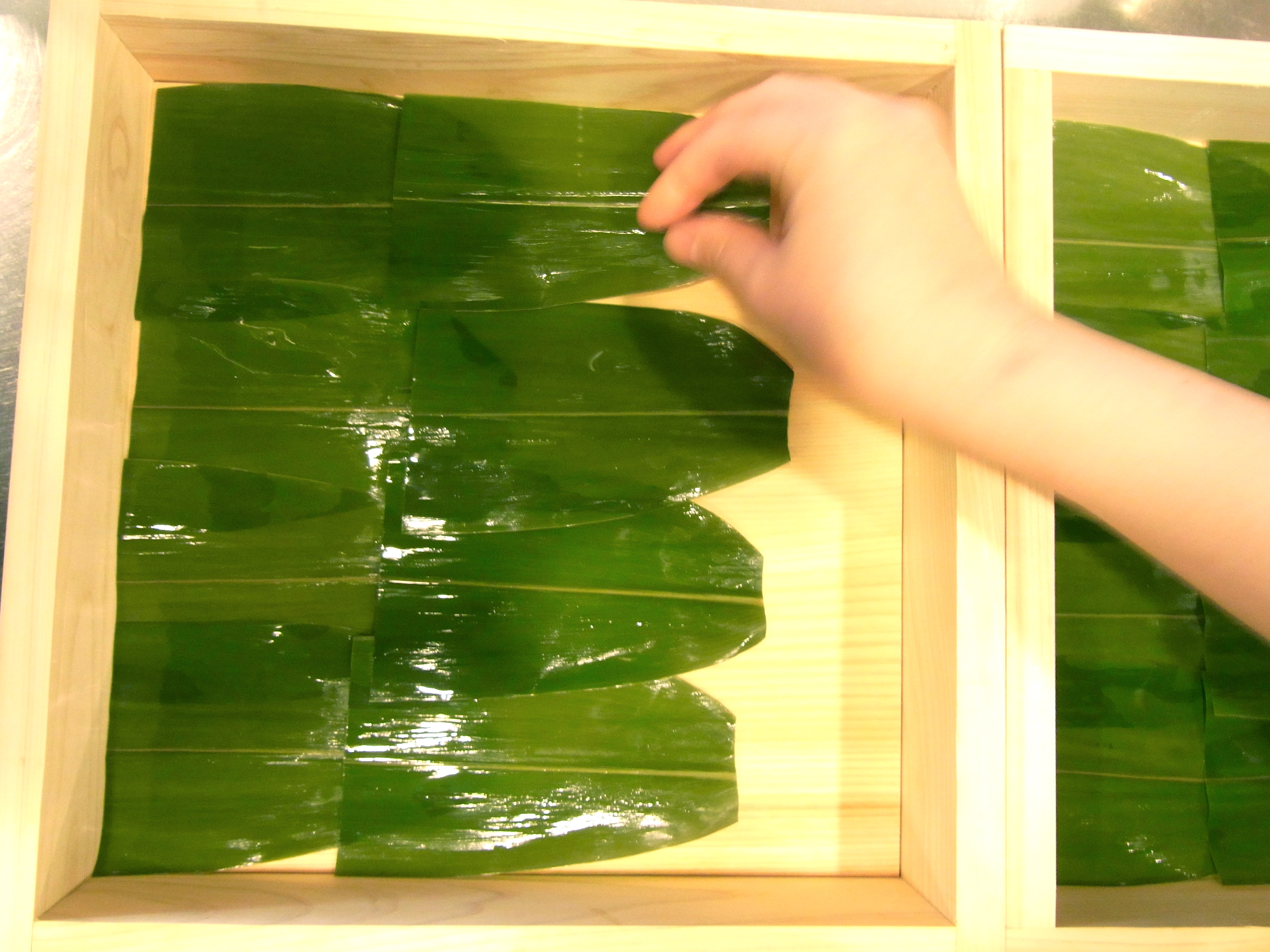 まず、木枠をはずした時に米が付かないように、下に笹を敷きます。