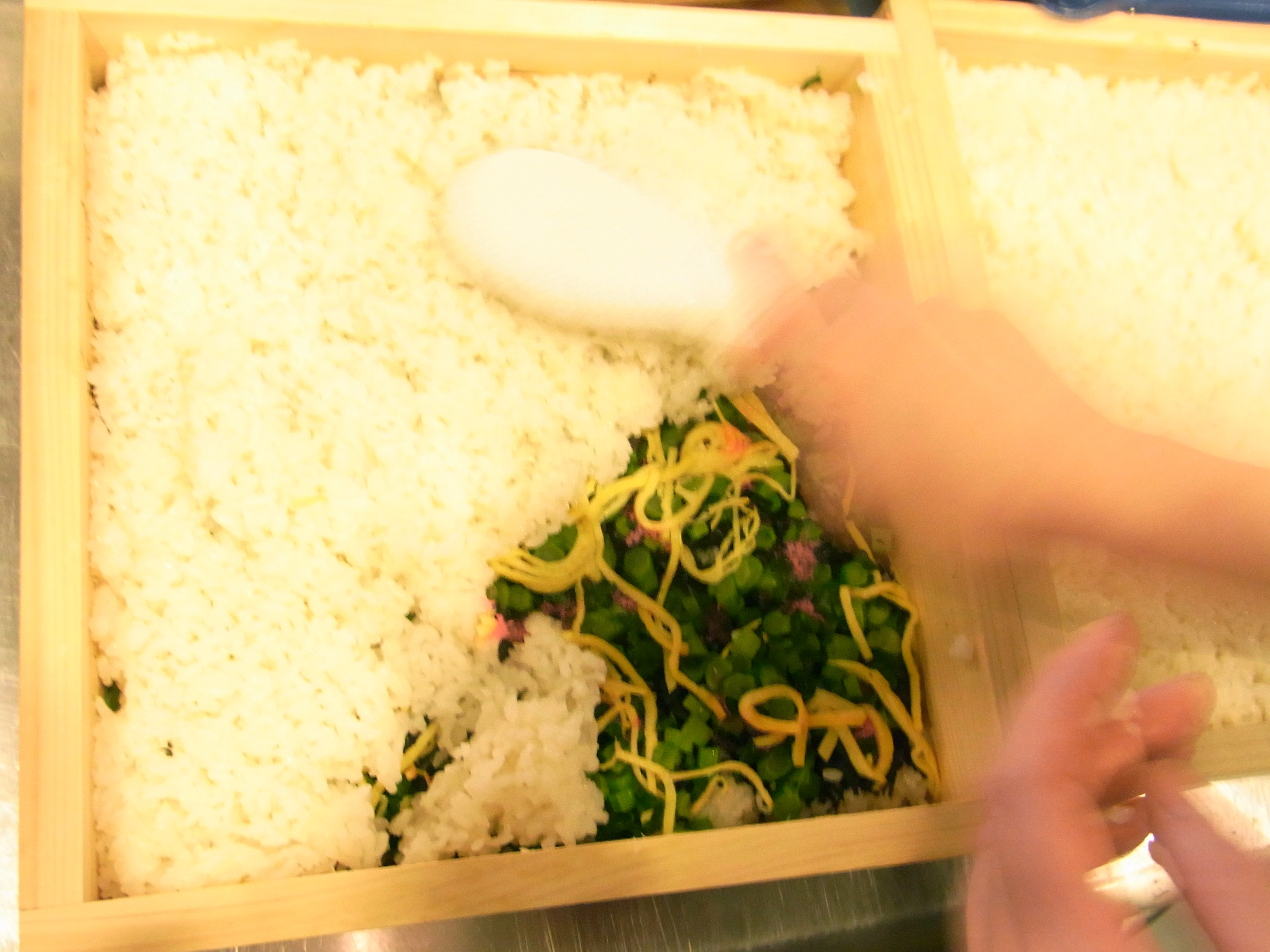 ごま、海苔、椎茸、菜の花、錦糸卵、桜でんぶ。
