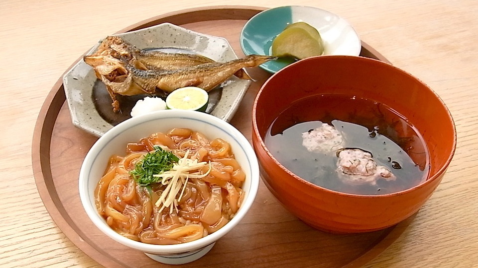 その日に上がった白イカを漬け丼にしてくれた地元のお母さん。