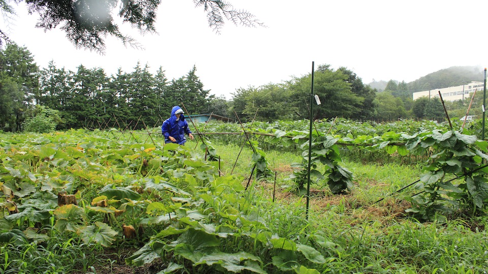 農園のまんなかに大きな木がひとつ、田村さんは”かぼちゃのなる木”と呼んでいます。
