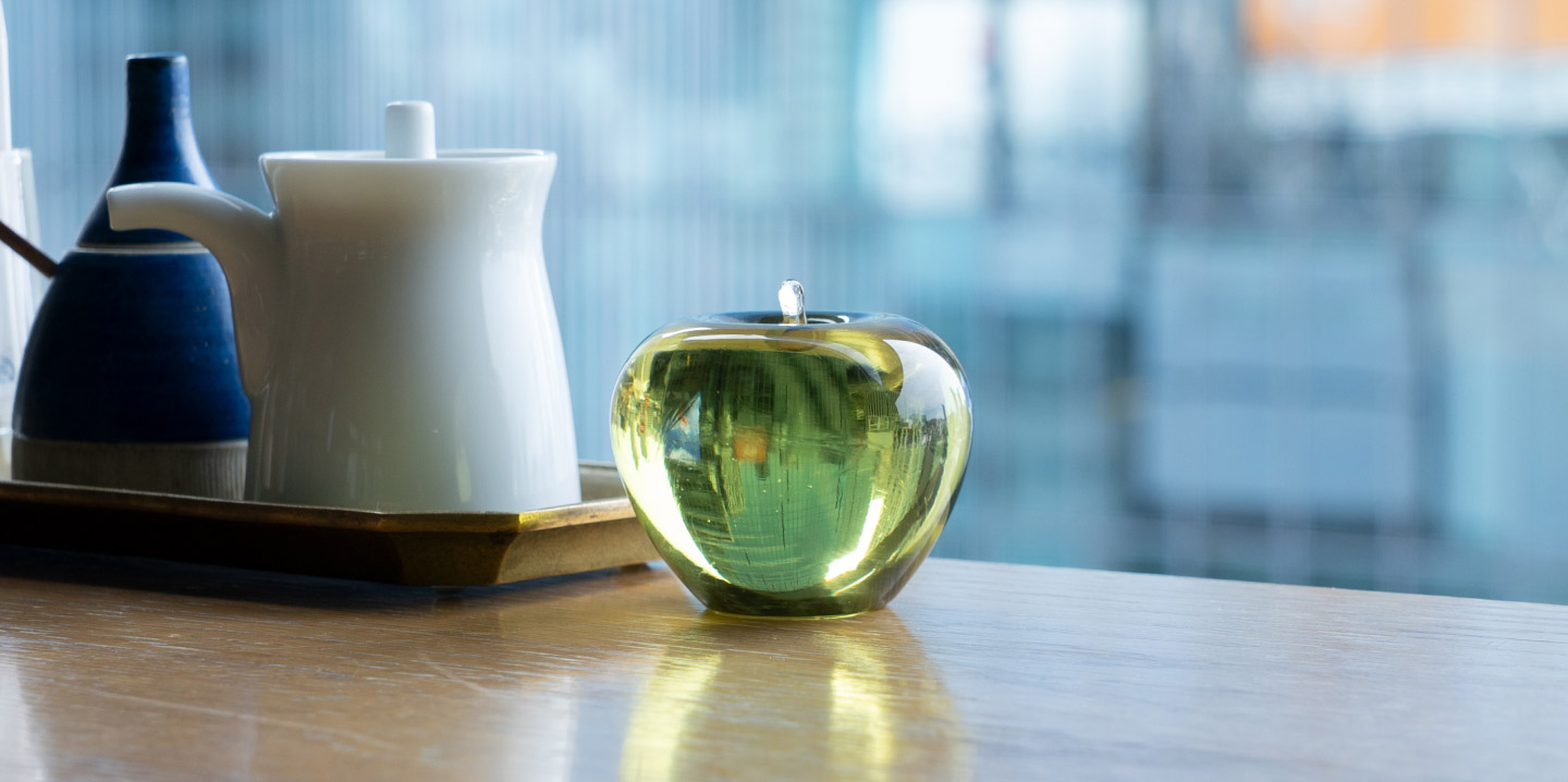 新島ガラスのりんごのオブジェをd47食堂のテーブルに展示します。火山石のコーガ石を原料に、硬質で光沢・表面強度に優れたオリーブ色の美しさ、つるんとした手触りや、りんごの中に逆さに映り込む渋谷の空と高層ビルを眺めにきてください。