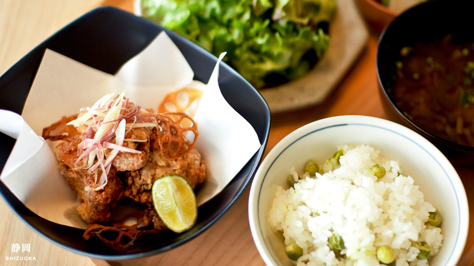 静岡産ふじのくにいきいきどりのもも肉をつかった唐揚げと、黒はんぺんの小鉢。