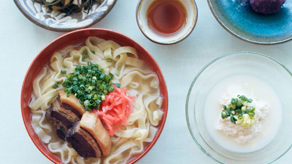 食前に黒麹もろみ酢、小鉢には、ゆし豆腐・紅芋のアンダギー・素材を活かしたイリチー、沖縄野菜の和え物など盛り沢山。メインには三枚肉をのせた沖縄そば。