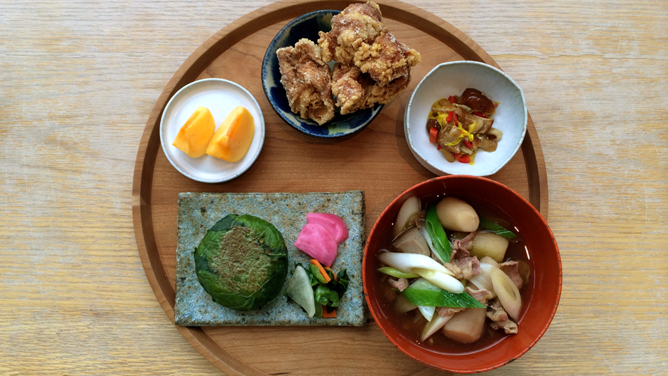 山形定食(数量限定) 1,650円 甚五右エ門芋で作る山形の行楽料理、芋煮と青菜(せいさい)漬けでおむすびを包んで焼いた菜っ葉飯。貴重な保存食のお漬物やお麩のからあげ。春夏秋冬食べるねばねば料理の小鉢と山形の在来作物、庄内柿付き。