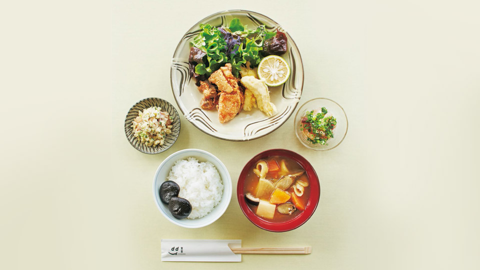 大分定食(数量限定) 1,850円 野菜と手延べ団子麺の「団子汁」。冠地鶏は「とり天」「モモ肉とズリの唐揚げ」で。ブリは漁師飯の「りゅうきゅう」とおからで和えた「きらすまめし」で食べ比べ。竹田市特産冬茹椎茸の旨煮付き。