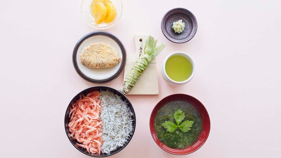 | 静岡定食 釡揚げしらすと桜エビ丼 1,750円 用宗港で水揚げされたしらす、由比で水揚げされた桜エビの釡揚げの二色丼には、おろしたての伊豆天城山の湧き水で育ったわさびをつけて。自家製黒はんぺんのフライ。 田尻屋のわさび漬けの小鉢。