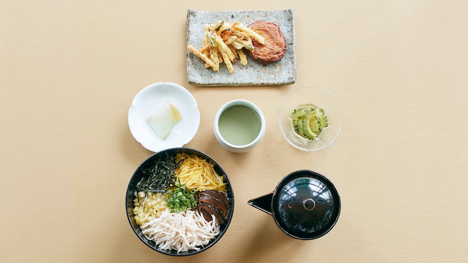d design travel 鹿児島 号発刊記念関連メニュー 鹿児島定食 鶏飯 1,700円 まずは、麦味噌・緑茶・鰹節の入った「茶節」を一杯飲んだら、熱々の出汁を鶏肉やパパイヤ漬などがのったご飯にかけた「鶏飯」を食べながら、「がね」(さつまいものかき揚げ)と「つけあげ」(さつま揚げ)を。箸休めに「ゴーヤの黒酢漬け」。甘みに「ぼんたん漬」を。