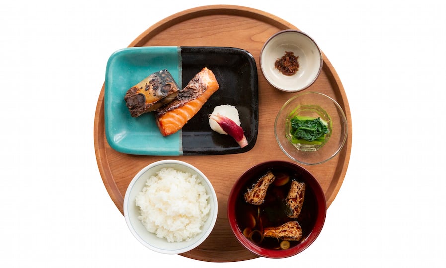 Fermentation Tourism Nippon 関連メニュー 旨味づくし定食 1,700円 石川県、能登に伝わる魚醤「いしる」に漬けたサバと秋田の「しょっつる」に漬けたサーモンを焼き魚で。たまり醤油で炊いたちりめん佃煮、白たまりのおひたし、八丁味噌のお味噌汁。醤油と味噌がたっぷり楽しめる。