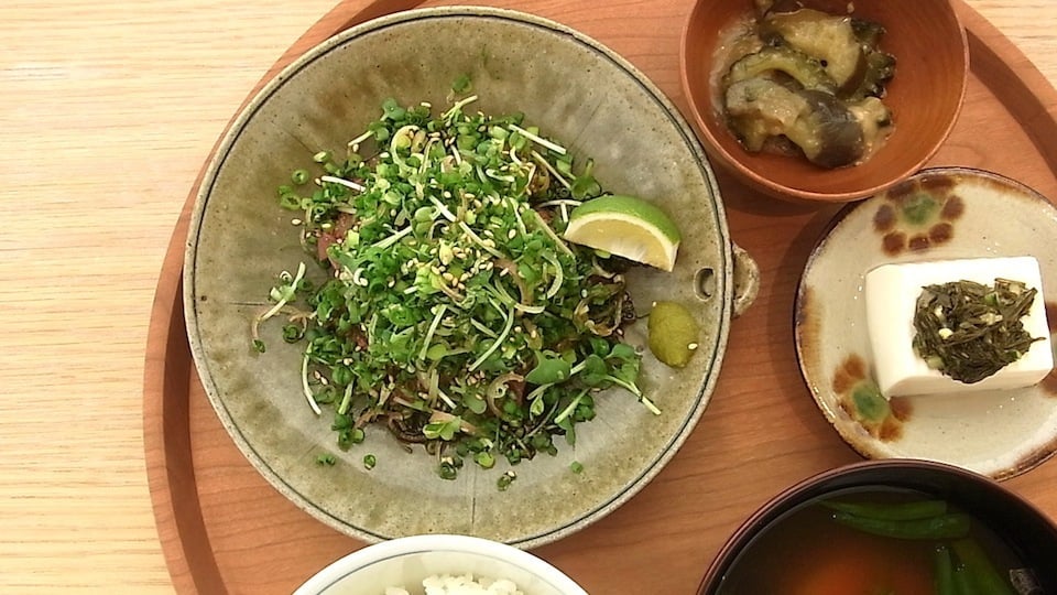 大分定食 りゅうきゅう 1,780円 ぶりの刺身を柚子胡椒入りのタレに漬け込み薬味をのせた、郷土料理の「りゅうきゅう」。小鉢は、茄子とゴーヤを味噌で炒めた「おらんだ」と、 大分産シラスをのせた冷奴。