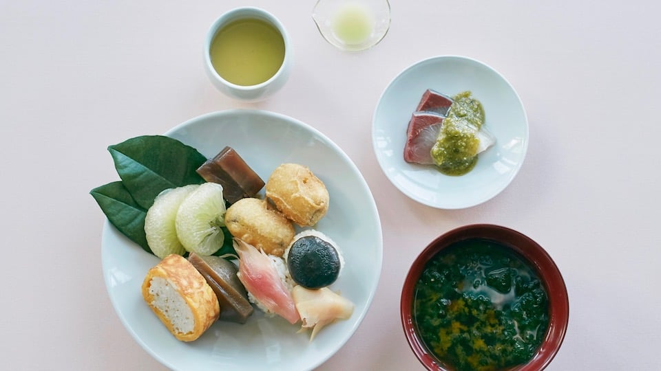 高知定食 田舎寿司 1,980円 田舎寿司、芋天、栗羊羹、文旦を一皿にぎゅっと詰め込んだ皿鉢料理、ブリぬたの小鉢、tretre d47食堂オリジナルブレンドティーを一膳に。