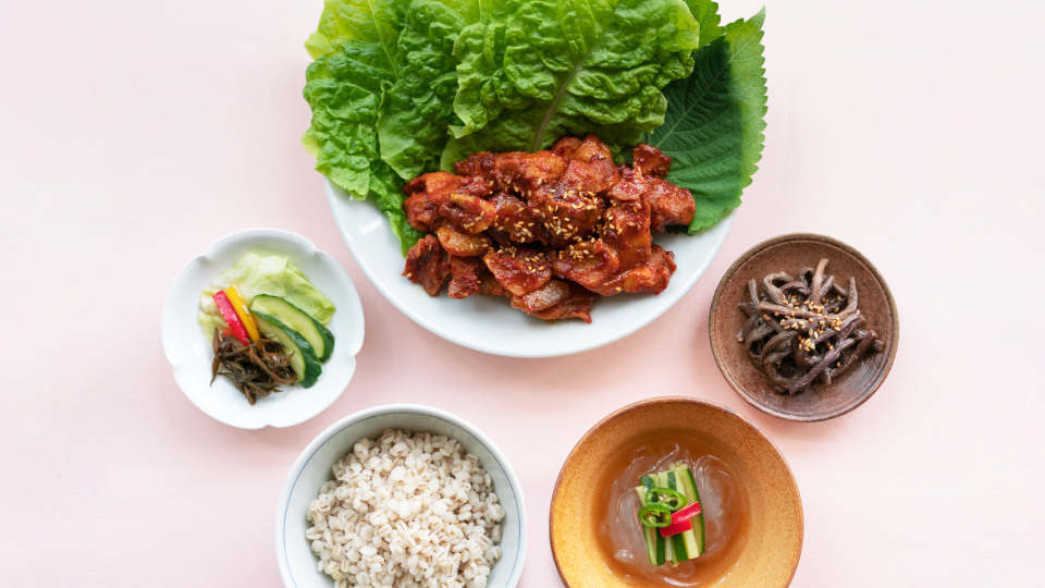 | チェジュ島定食 みかんコチュジャンの豚プルコギ 1,980円 d食堂チェジュから教わったオリジナルみかんコチュジャンの豚プルコギをメインに、チェジュ島の食文化がつまったパンチャン(おかず)の数々。 ▶︎インスタグラムのハッシュタグ投稿やアンケート参加者から抽選で、チェジュ島への往復航空券や、チェジュ島のおみやげセットが当たるキャンペーンも実施中!詳しくはこちらから。
