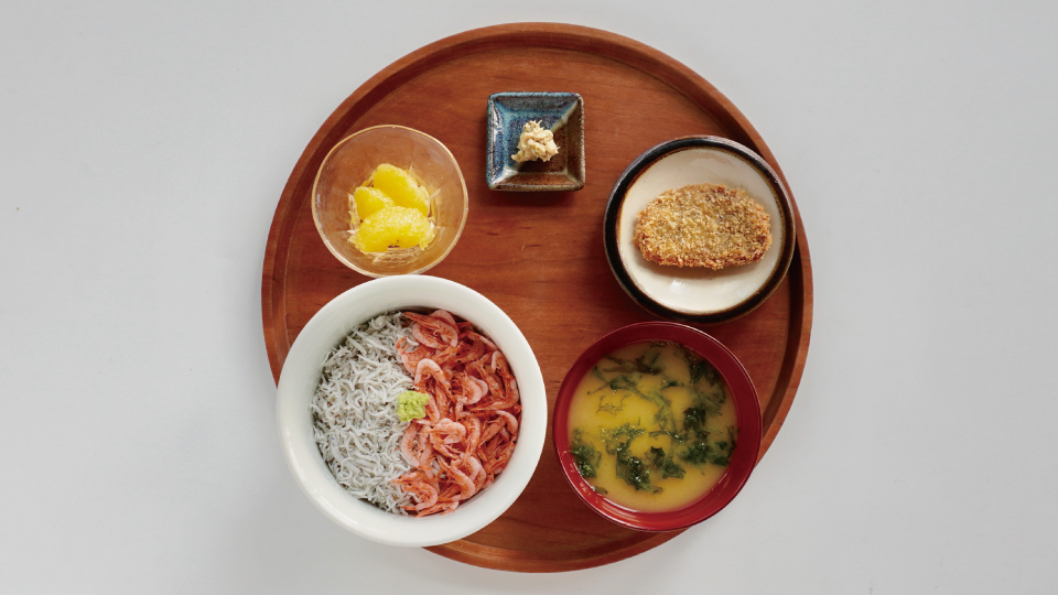 静岡定食 釜揚げしらすと桜エビ丼 2,100円 駿河湾で獲れるしらすと桜エビの釜揚げ二色丼と黒はんぺんのフライ、わさび漬、自然栽培の柑橘。海と山を味わう一膳。
