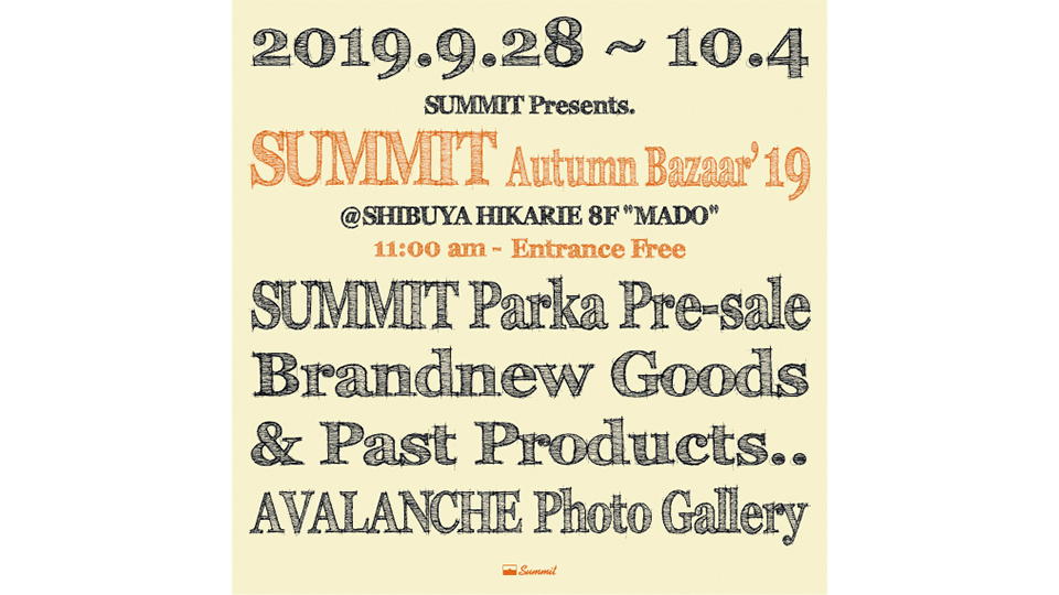 10/5(土)、10/6(日)に新代田FEVERにて毎年恒例パーティー"AVALANCHE 9"を開催するイベントに合わせたSUMMITのバザーとなっております。