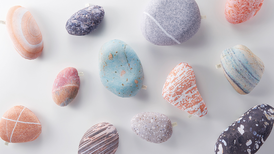 クッションは、デザイナーが旅先で拾い集めた石をモチーフに、テキスタイルから仕立てました。