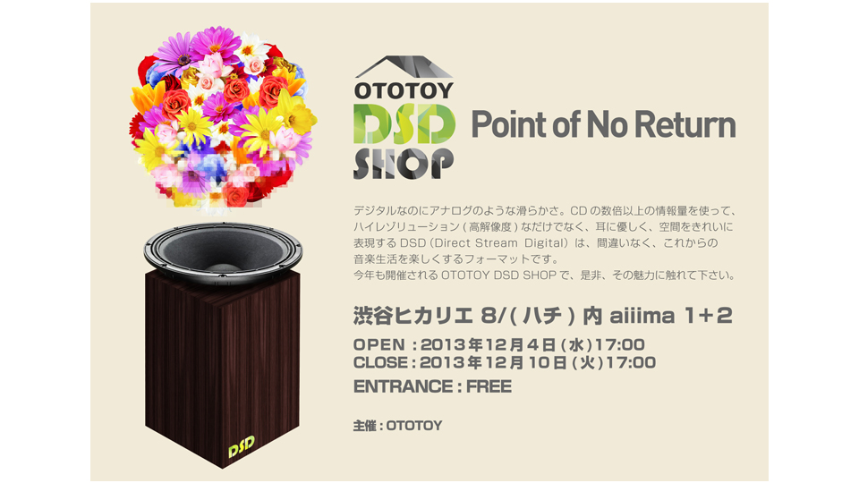 DSDのサウンドは一度、体験したら、忘れられません。昨年の暮れ、OTOTOY は渋谷ヒカリエで最初のOTOTOY DSD SHOPを開催しました。2012年には数多くのオーディオメーカーが、DSDを再生するプロダクツを発表したからです。OTOTOYでは2010年からDSDによる高音質配信を進めてきましたが、いよいよ、時代がそれに追いついてきた。そして、2013年にはさらに多くのオーディオメーカーがDSD再生のためのプロダクツを発表。DSDを楽しむ環境は整った。もう後戻りはありえない=POINT OF NO RETURNをコンセプトに開かれるのが、今年のOTOTOY DSD SHOPです。