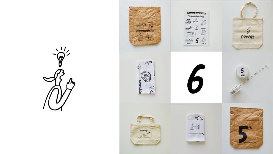 ラインナップは、手ぬぐい(かまわぬ製)/トートバッグ/タイベックバッグ/マスキングテープ/オリジナルステッカーの5種。