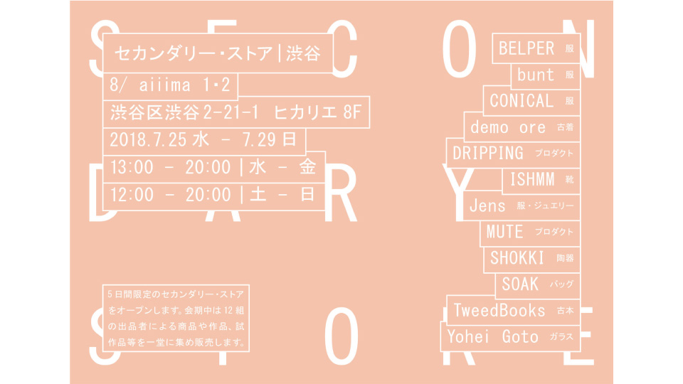 様々な分野のデザイナー・作家・ショップによる試作品やアーカイブなど「二次的な物」を集め販売する移動型店舗です。https://www.instagram.com/jp.secondarystore/