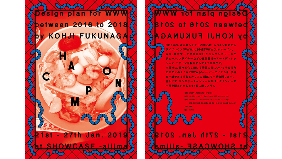 2016年秋、渋谷カルチャーの中心地、スペイン坂にあるライブハウス「WWW」の2号店「WWW X」がオープン。 以来、ロゴマークや毎月発行されるマンスリースケジュール、フライヤーなどの宣伝美術のアートディレクション、デザインを担当するフクナガコウジ。 本展では、日々変化し続ける渋谷の街について考えるための欠片のような「WWW」のペーパーアイテムを、渋谷を一望できる渋谷ヒカリエの8階にて一挙公開します。 合わせて、マンスリースケジュールのバックナンバーの一部を配布いたします(数に限りあり)。